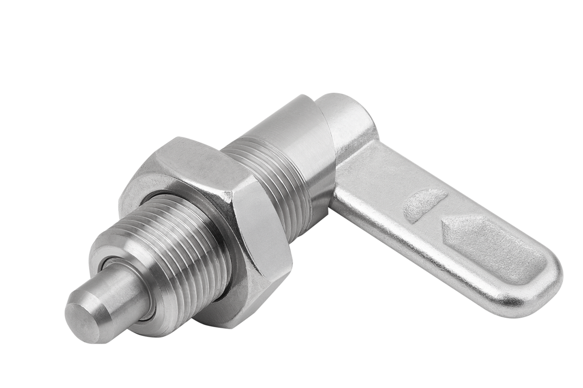 Cam-action indexing plungers are used where any change in locking position due to lateral forces should be prevented. Turning the grip through 180° retracts the indexing pin, enabling a change in the indexed position. The notch ensures that the grip remains in this position and the indexing pin remains retracted.