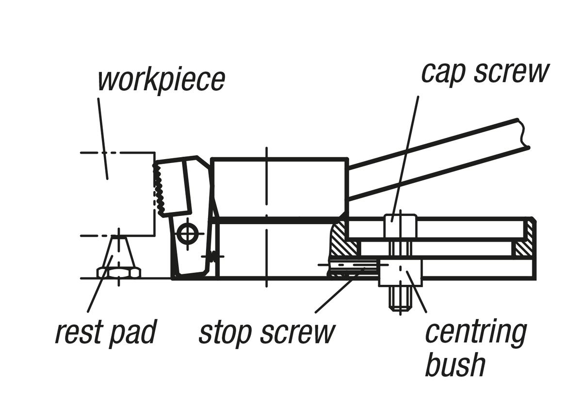 Using the stop screw and centring bush (see diagram), the side clamp can be mounted and positioned on a modular grid system.