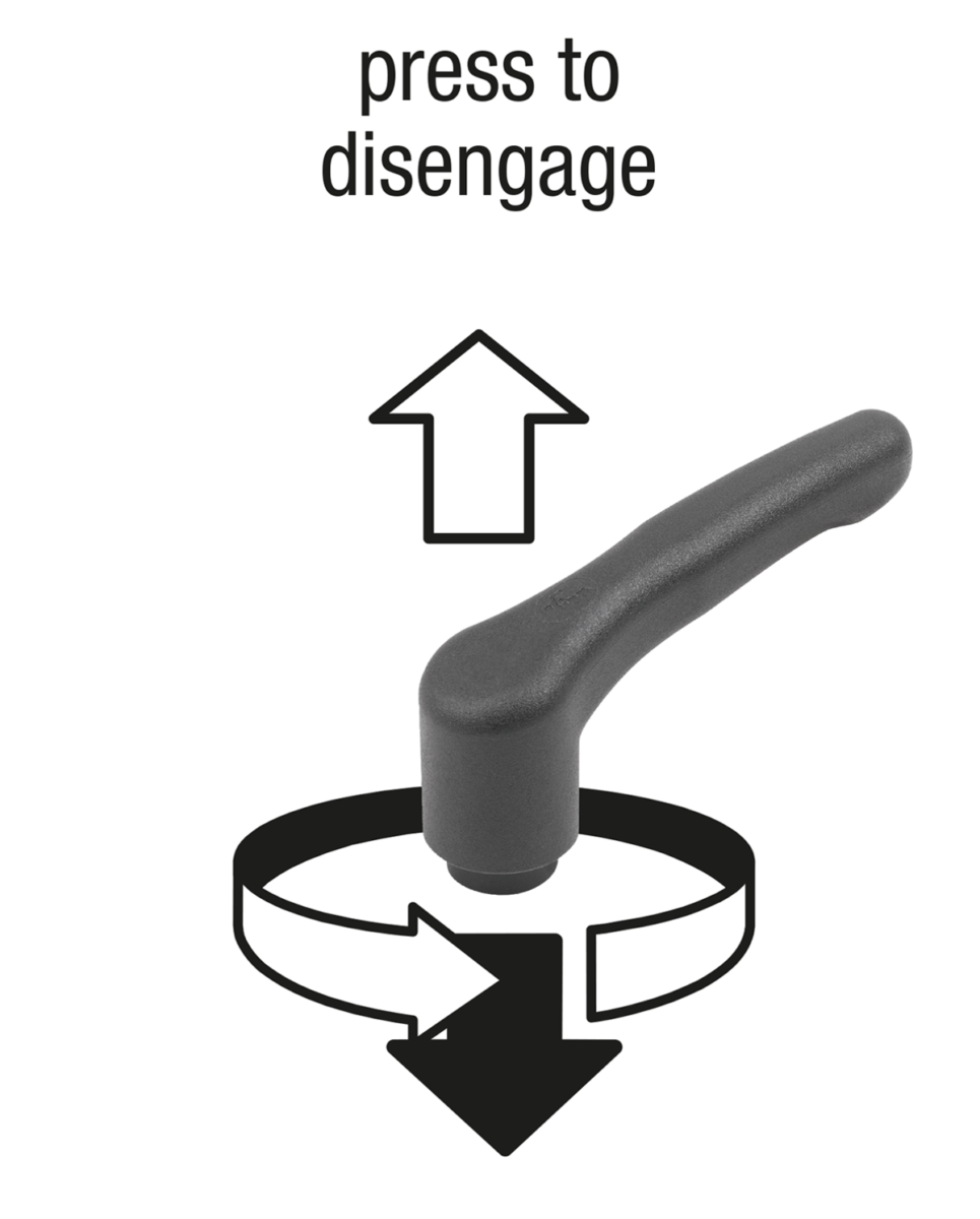 When not actuated the handle is engaged, thus allowing the thread to be fastened or released. When pressed, the handle can be re-positioned and then re-engaged in the gear ring by spring force.