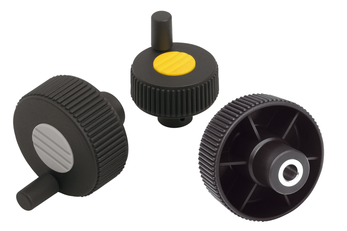 Räfflade rattar med grepp, Form M, med tvärgående hål och ställskruv