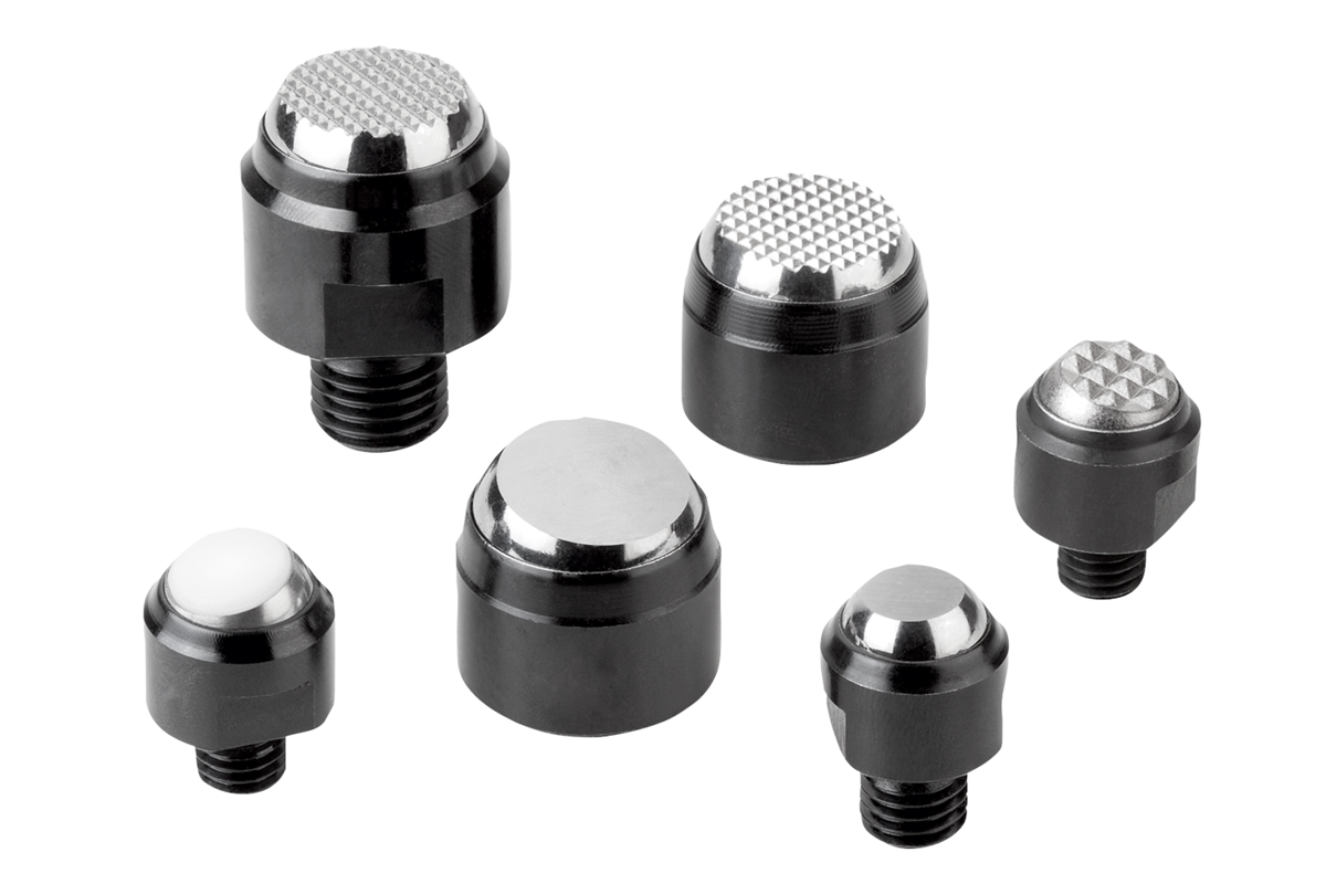 Self-aligning pads, Form M, with external thread, flattened ball, diamond grip